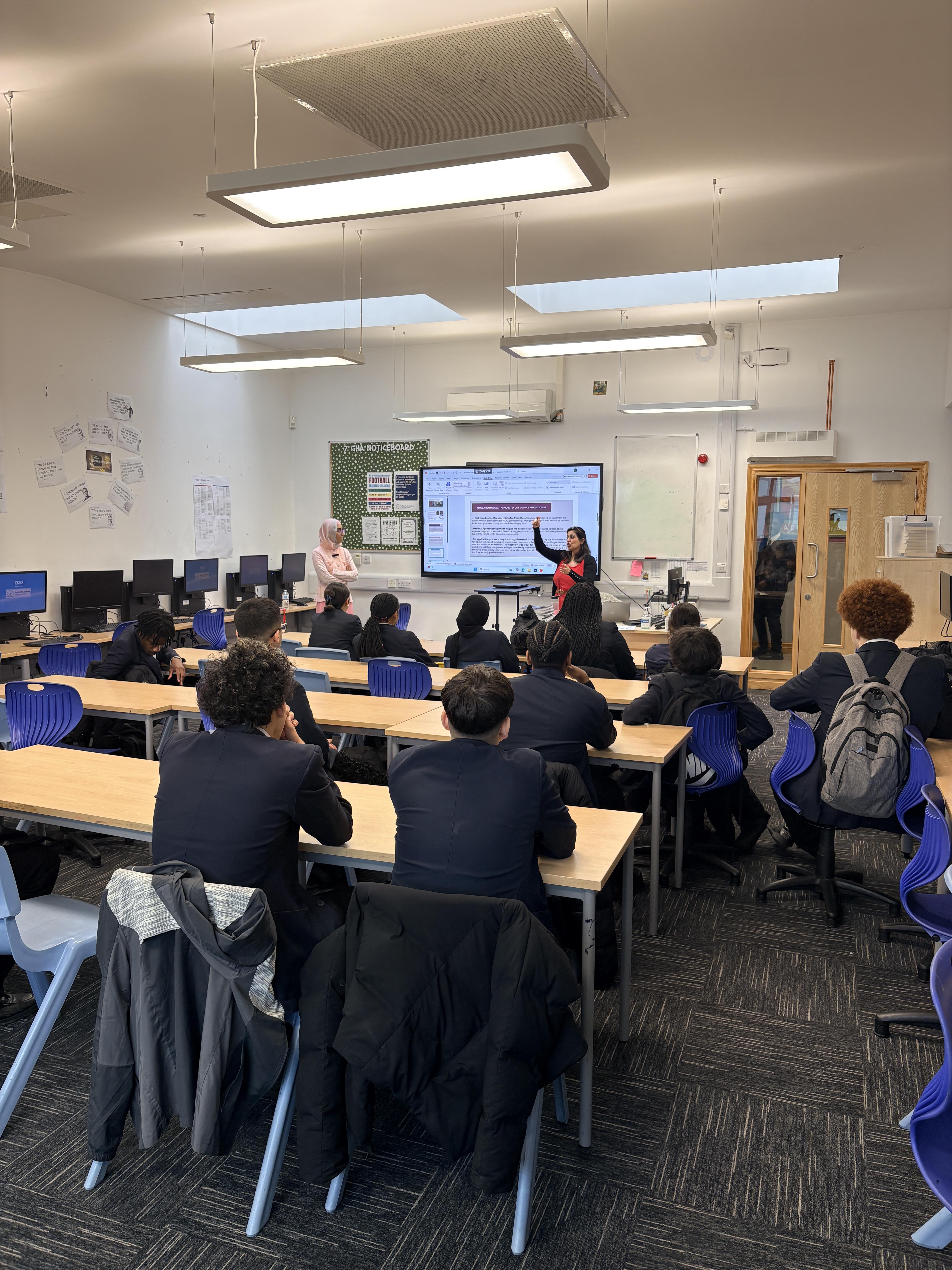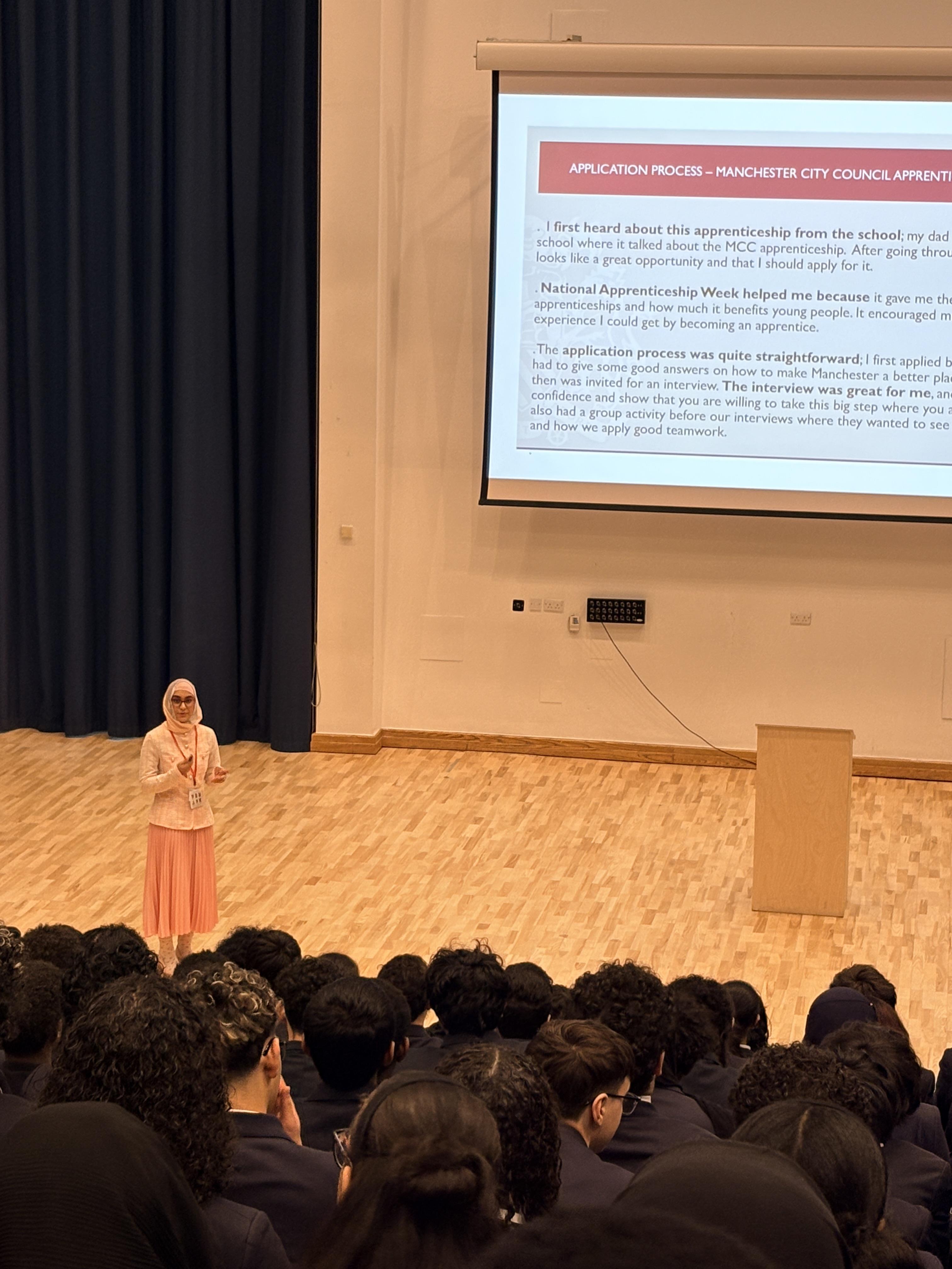 Her apprenticeship journey began when her family received an email from the Academy promoting opportunities with Manchester City Council. National Apprenticeship Week played an important role, helping her understand the value of apprenticeships and inspiring her to apply. The process involved completing an application form, taking part in an interview and participating in a teamwork activity. Alishba impressed the panel and was selected as one of only 15 successful candidates, supported by both her school and her family.